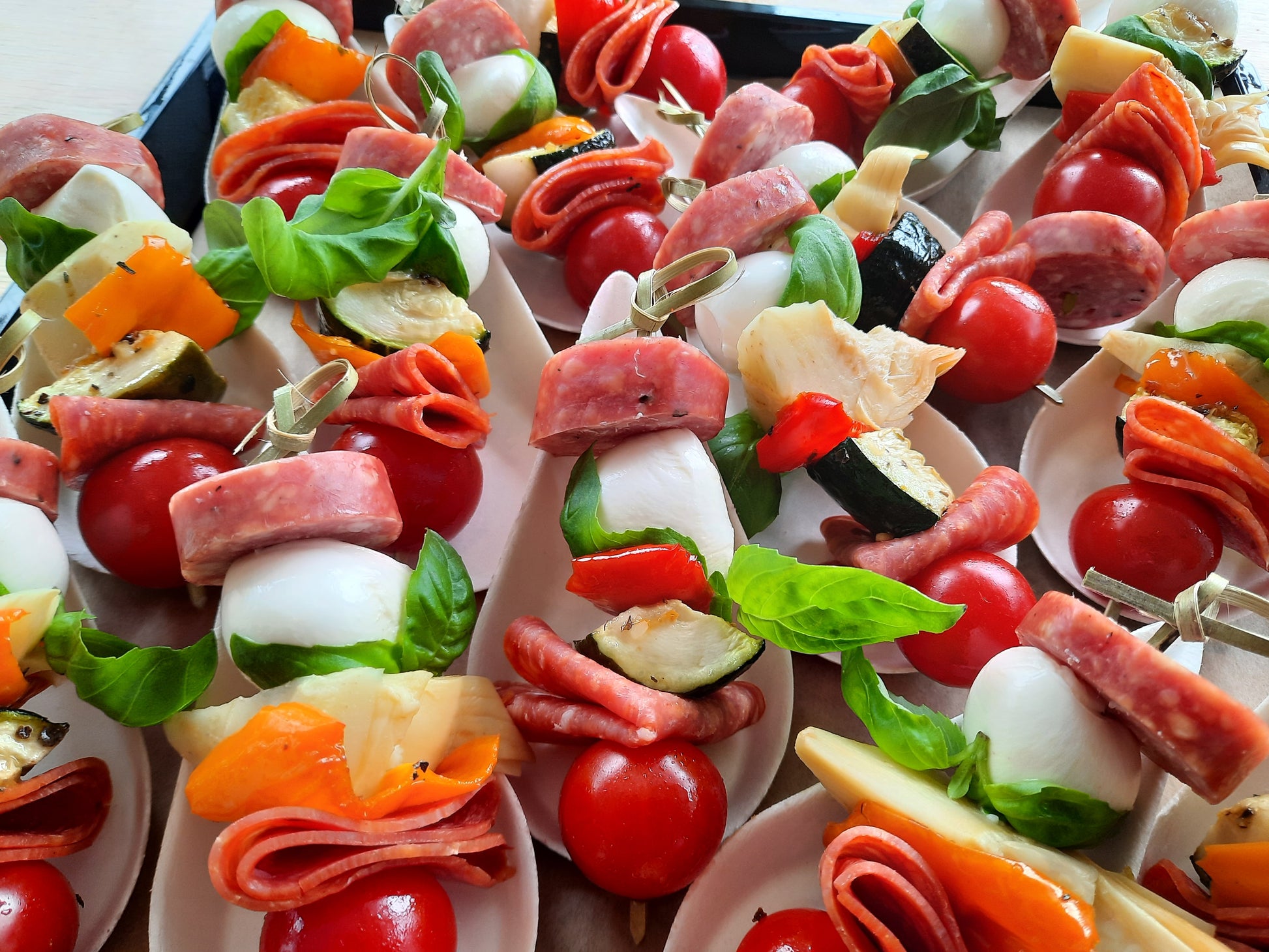 Cold appetizers | Assorted antipasto skewer (olive, bocconcini, tomatoes, peppers, chorizo, artichokes, salami...)