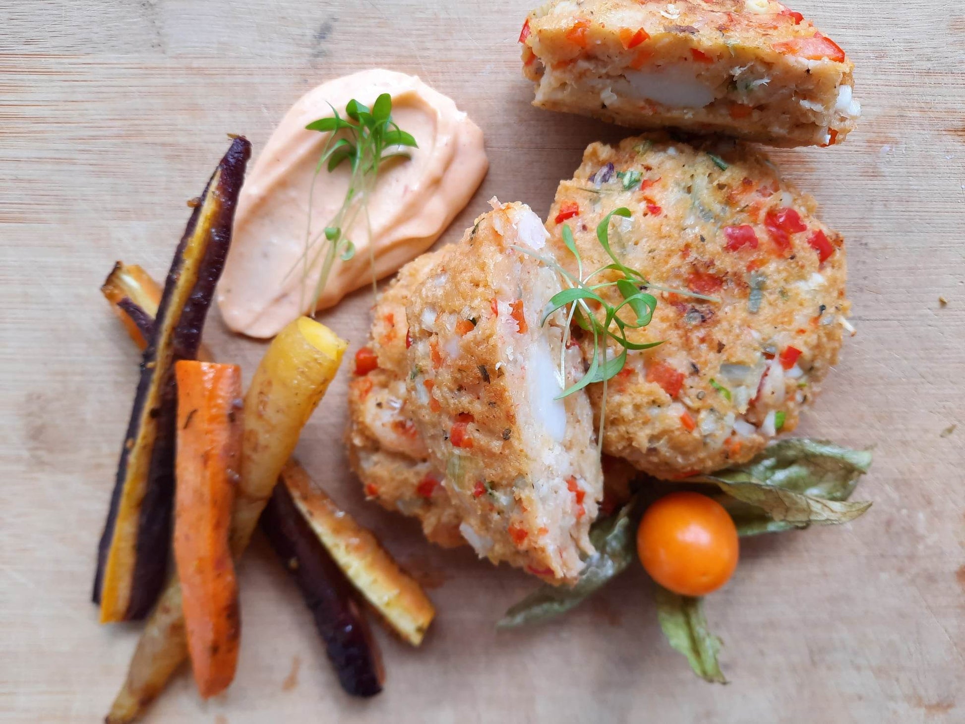 Cake aux fruits de mer, mayo chipotle et pousses du moment