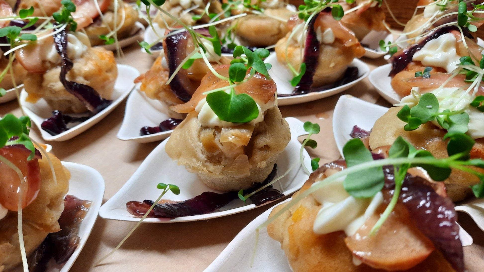 Bouchées froides | Beignets oignons caramélisés, cheddar fort et pommes
