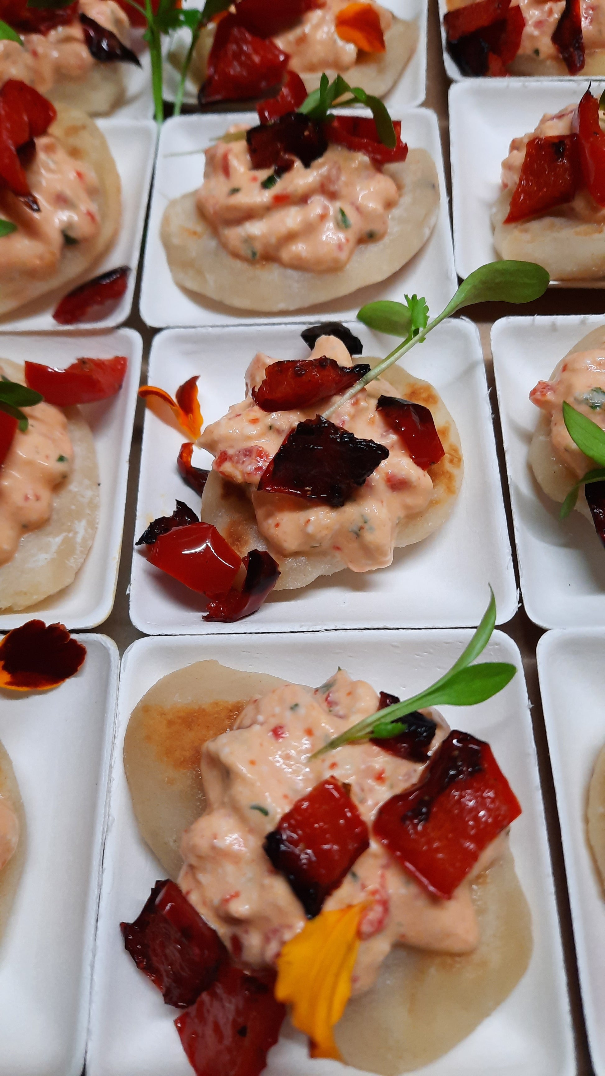 Bouchées froides | Ktipiti sur naan maison, garni de poivron rouge rôti (tartinade à base de yogourt, feta et poivrons rôtis)