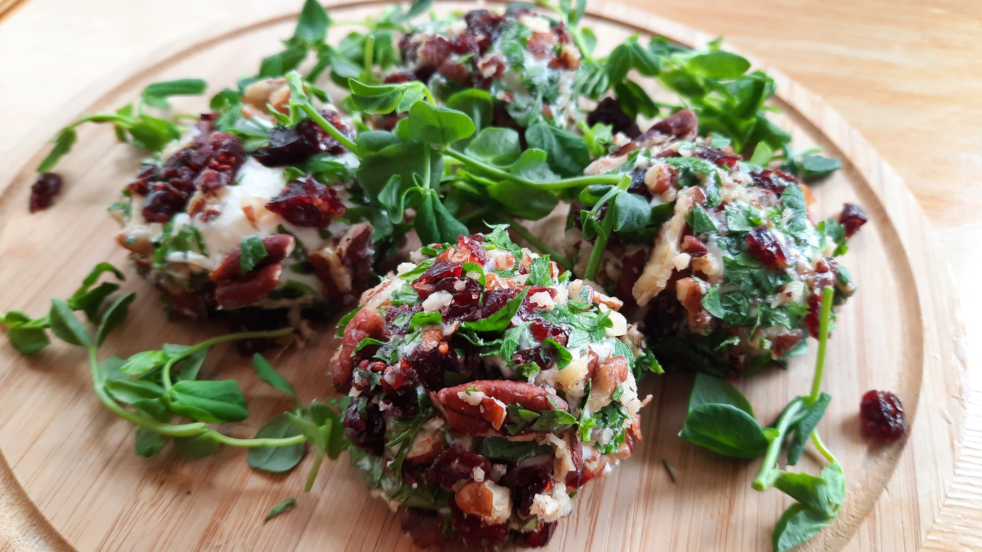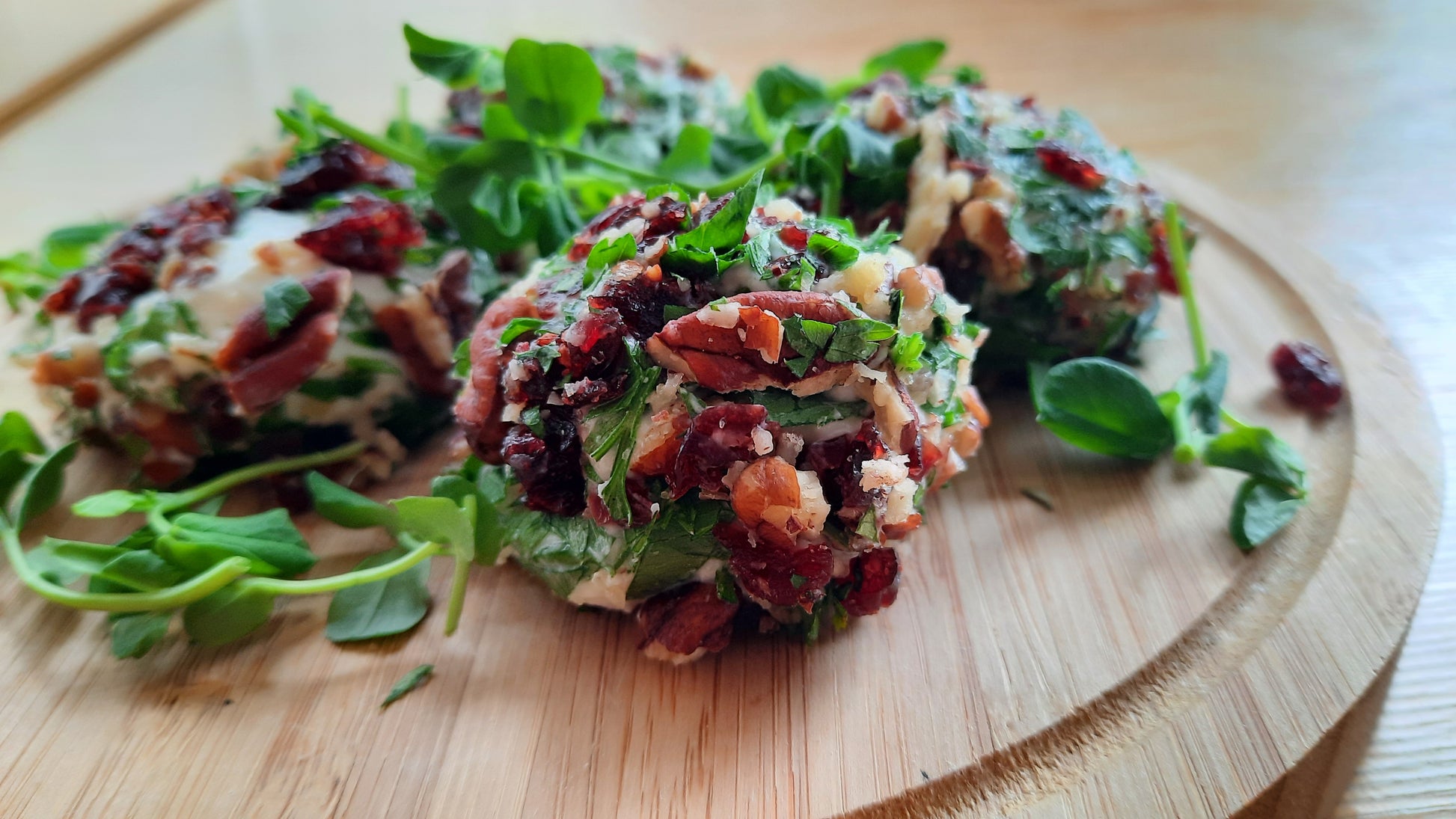 Truffle à la mousse de fromage au miel, pacanes, canneberges et persil